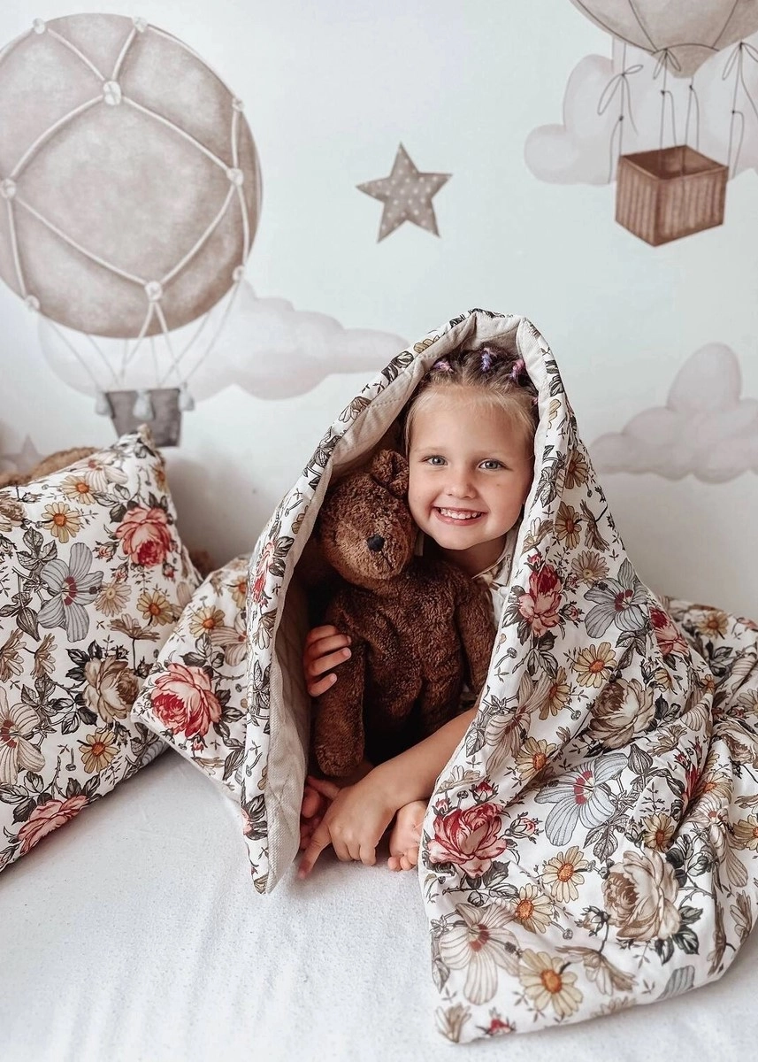 • Duży kocyk (100×135 cm) – z jednej strony miękki velvet pikowany, z drugiej oddychająca bawełna w pięknych, dziecięcych wzorach.