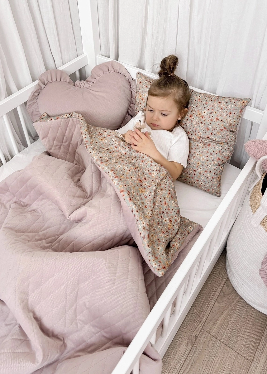 • Duży kocyk (100×135 cm) – z jednej strony miękki velvet pikowany, z drugiej oddychająca bawełna w pięknych, dziecięcych wzorach.