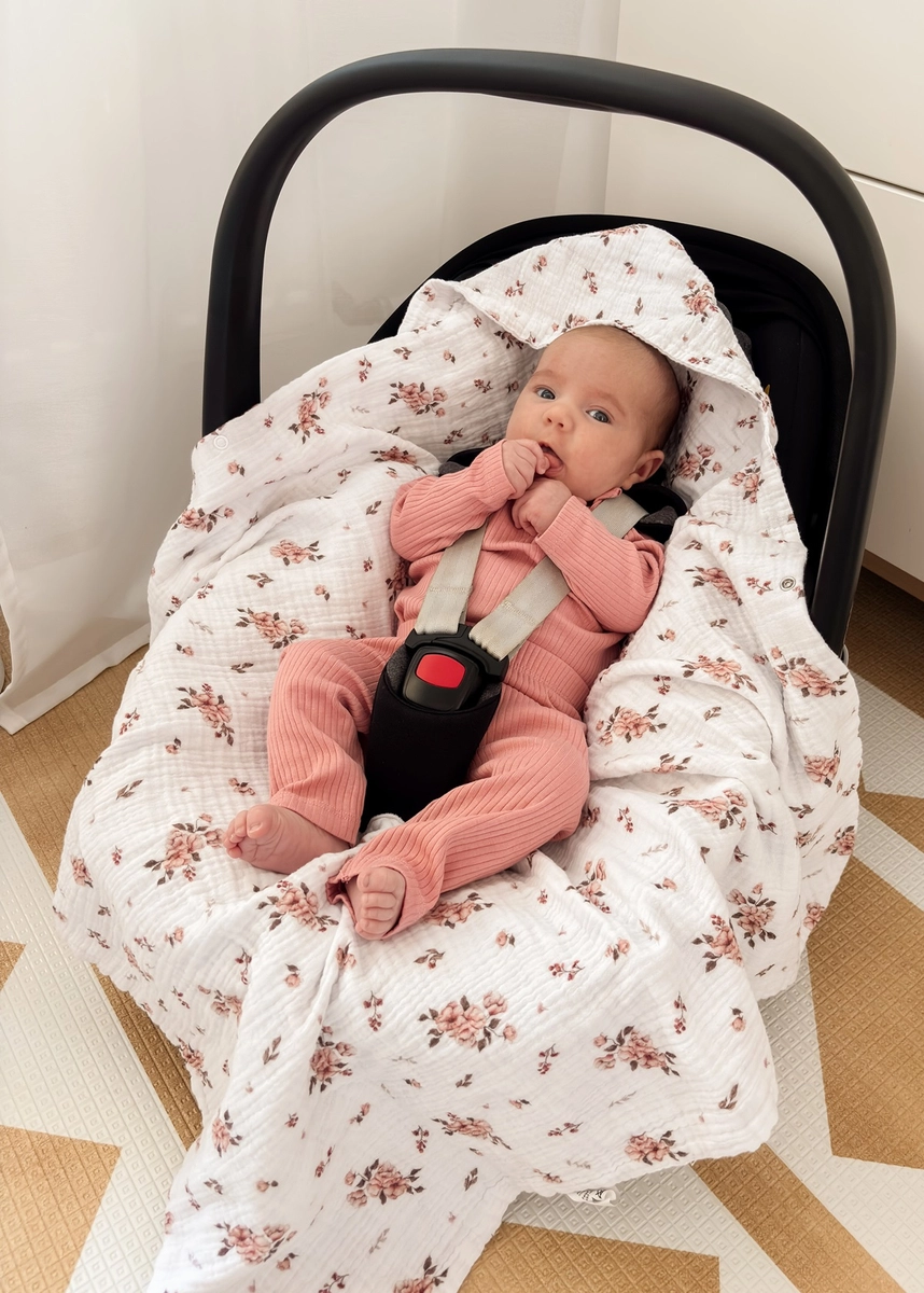 Niezwykle miękki i delikatny otulacz do fotelika, uszyty z najwyższej jakości muślinu bawełnianego double gaze.