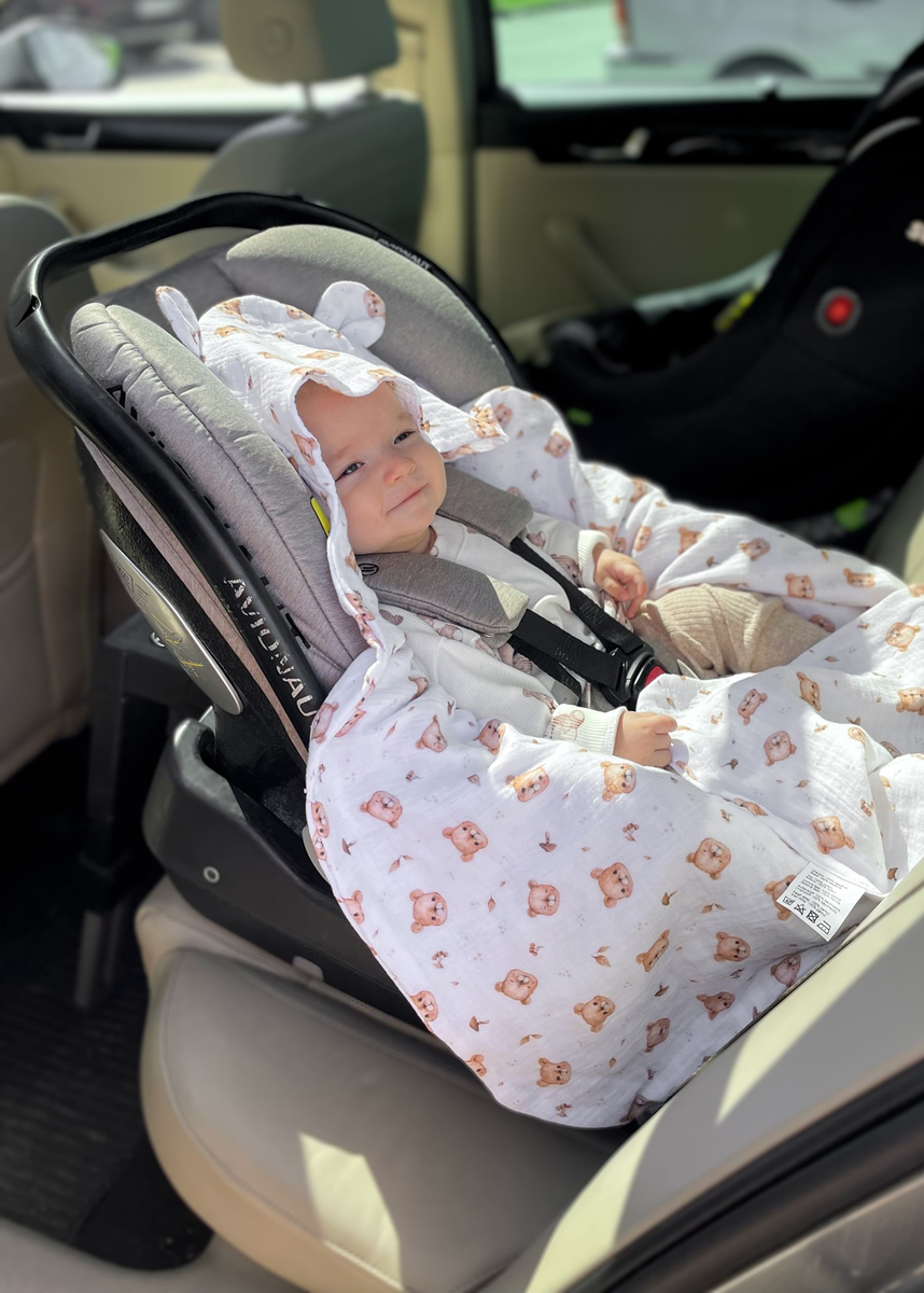 Muślinowy otulacz z kapturkiem do fotelika TEDDY BEAR