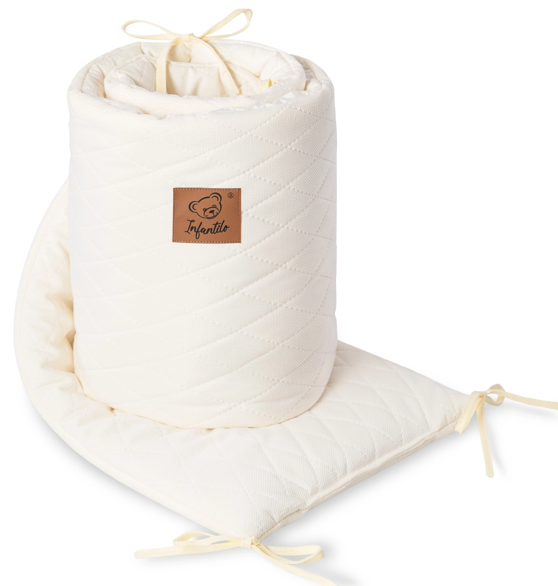 Ochraniacz wiązany jest na troczki, dzięki temu nie przemieszcza się w łóżeczku.