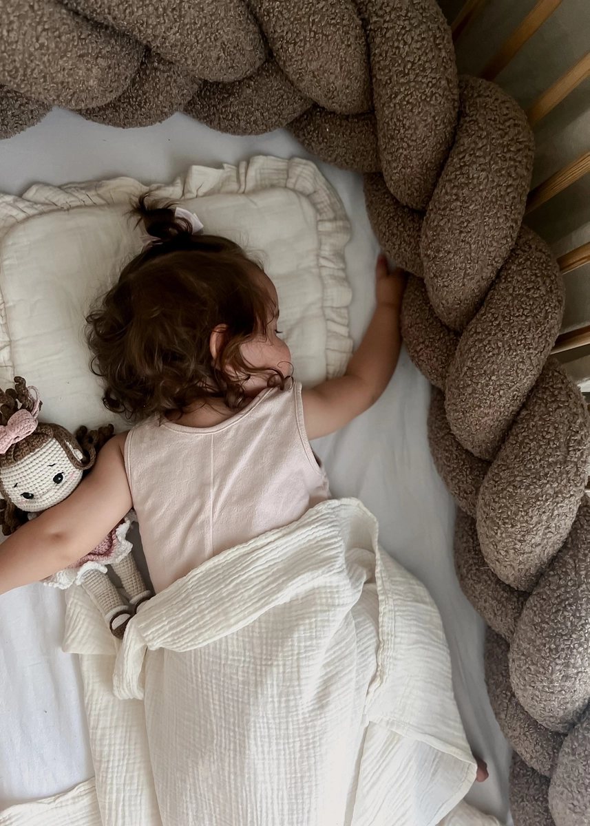 Miękki i przytulny materiał baranek boucle – przypomina pluszowy kocyk, zapewniając dziecku komfort i ciepło.Ochrona i bezpieczeństwo – warkocz chroni maluszka przed uderzeniami o szczebelki łóżeczka i zapobiega zaklinowaniu rączek czy nóżek.