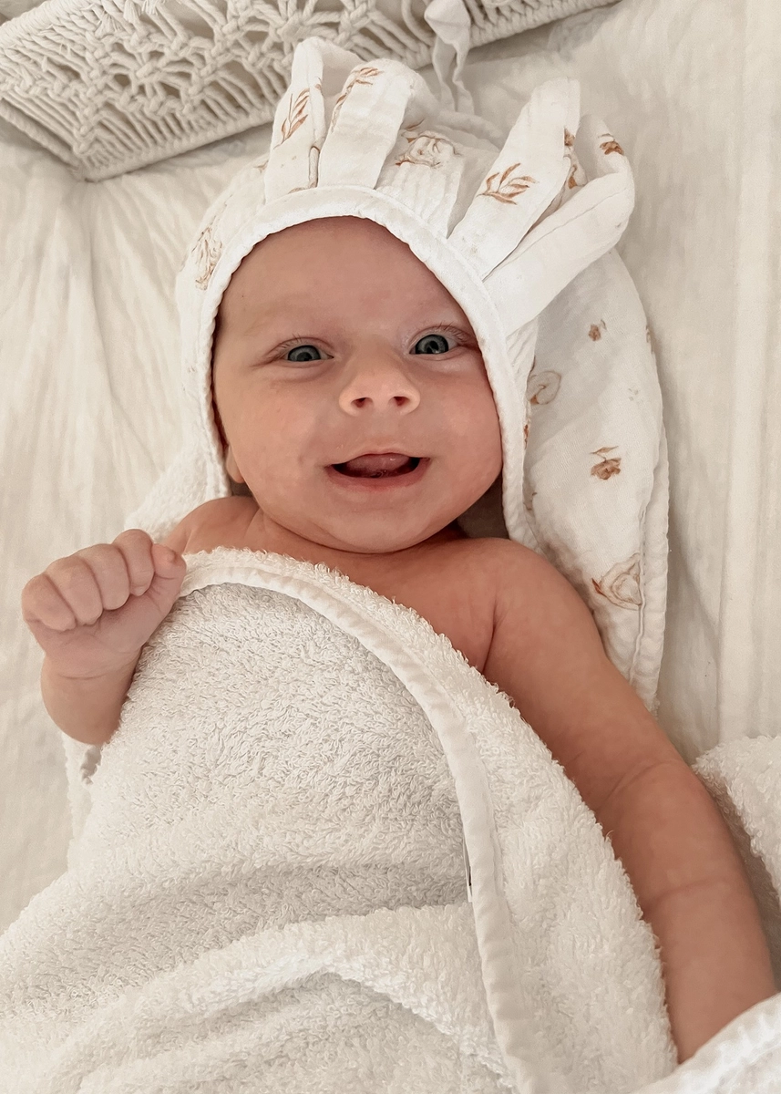 Kapturek okrywający głowę doskonale wchłania wodę, dokładnie osuszając delikatną skórę dziecka.