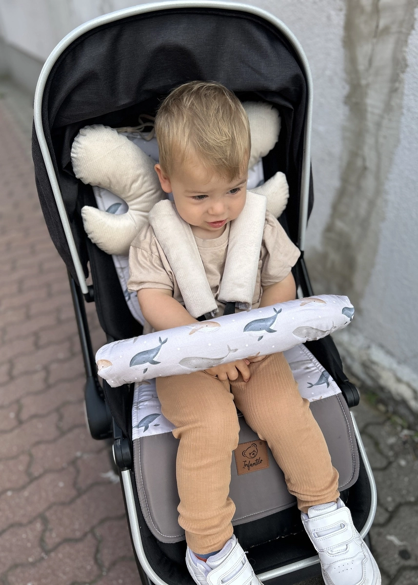 • Dwustronną wkładkę do spacerówki wyposażoną w troczki do przymocowania na wózku, co zapobiega jej zsuwaniu się.